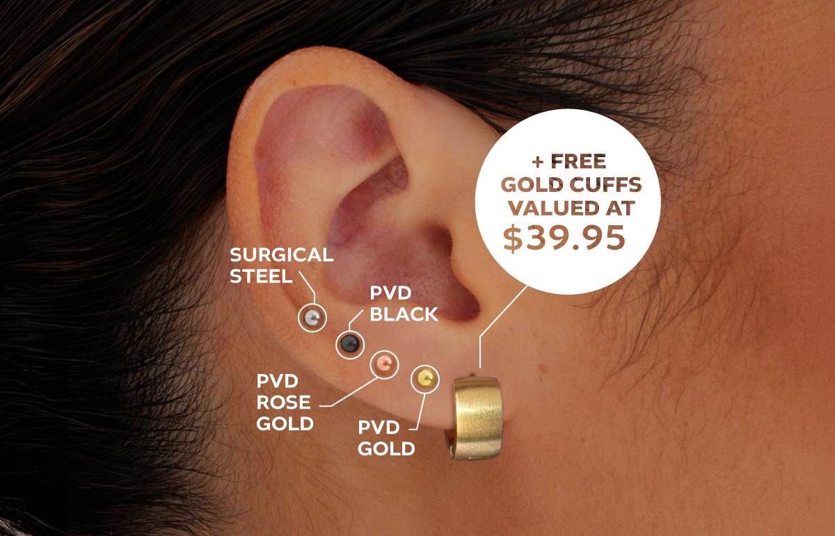 The best part? Your choice of metal is included in the price of your piercing, so there’s no extra cost to upgrade your style. Plus, for a limited time, you’ll also receive a FREE pair of waterproof gold ear cuffs valued at $39.95* with any ear piercing at Essential Beauty.