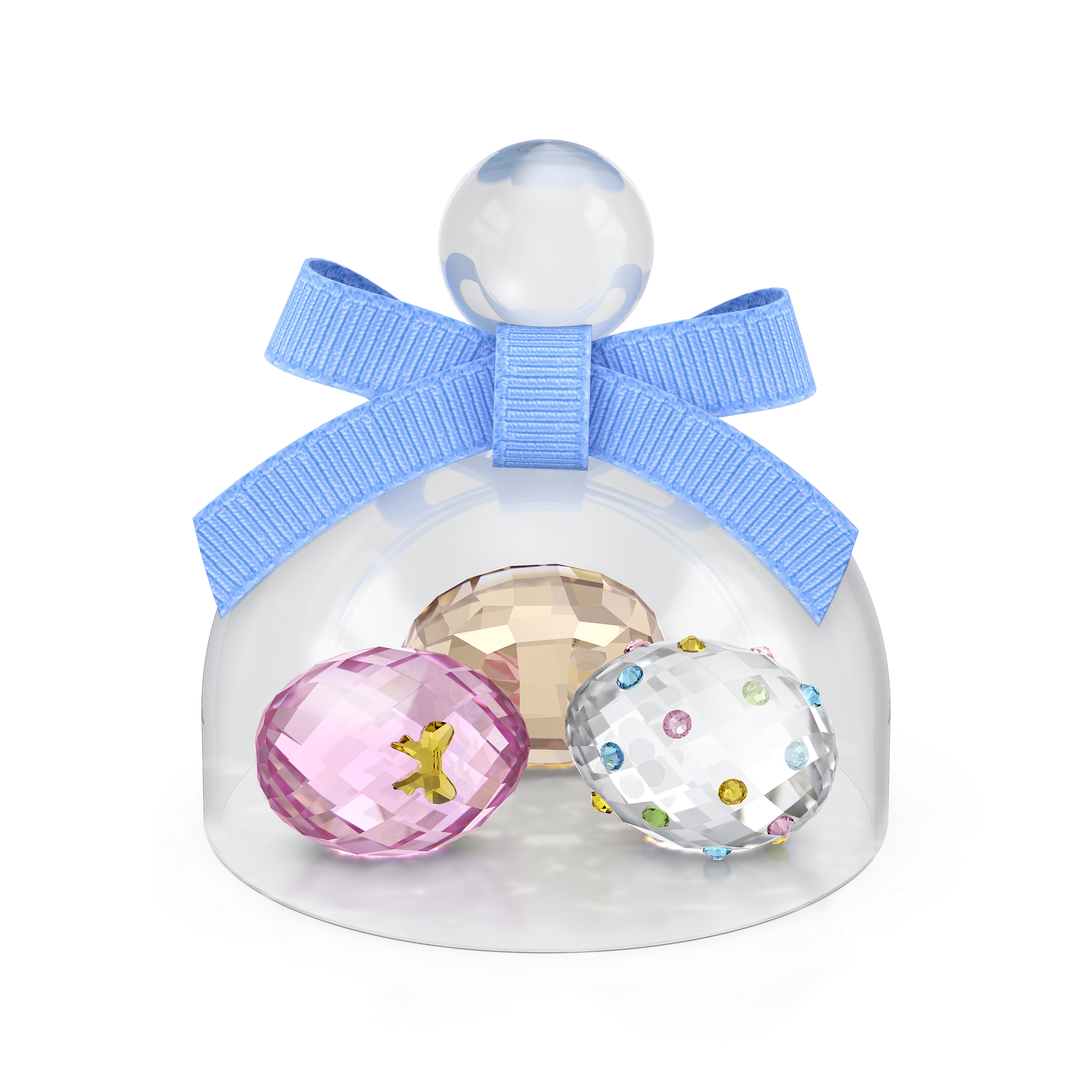 Celebrating the season of new beginnings, this playful design features three loose eggs beneath a transparent glass dome. Tied up with a blue ribbon, the entire design creates a light-reflecting centrepiece that can be freely arranged as your heart desires.