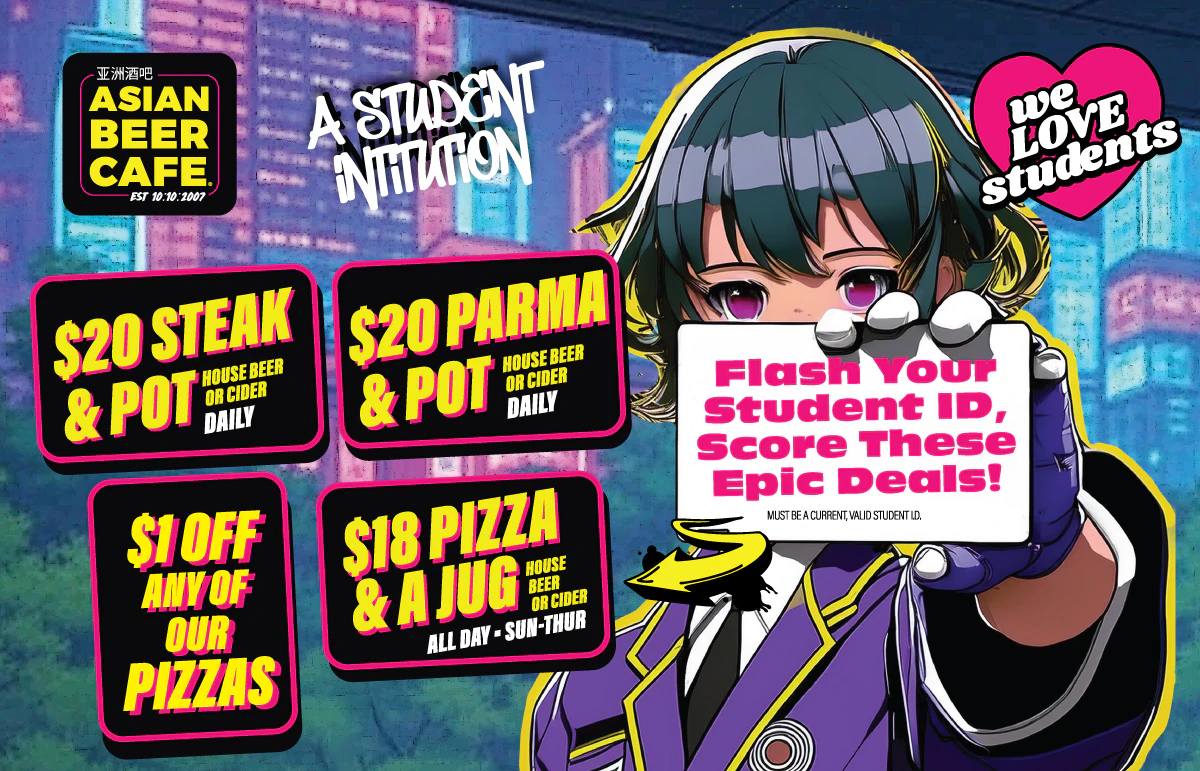 Flash your student I.D. and enjoy a $20 parma & pot, $20 steak & pot, $18 pizza & jug of beer (sunday-thursday) or $1 off any pizza.