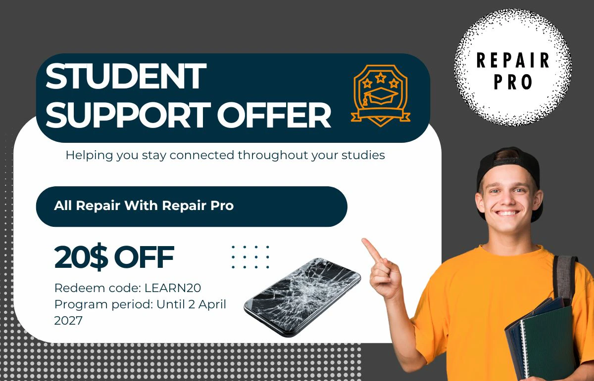 Valid for students only with a valid student ID. Offer applies to repair services only and cannot be combined with other promotions. One redemption per customer. Offer valid until 2 April 2027. Code can be used for both online bookings and in-store services. Repair Pro reserves the right to modify or withdraw this offer at any time.