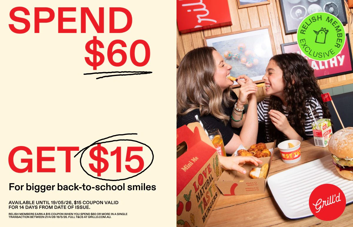 Relish Members earn a $15 Grill’d coupon when you spend $60 or more in a single transaction between 21/4/26-19/5/26. Full T&CS at grilld.com.au.